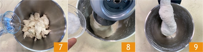 Transférez le préferment dans le pétrin et ajoutez environ trois quarts de l'eau prévue pour la pâte 7, puis mettez en marche à la vitesse la plus basse. Dès que la pâte commence à se former, ajoutez le sel 8 et le reste de l'eau en la versant en filet. Travaillez jusqu'à obtenir une pâte lisse et bien formée 9.