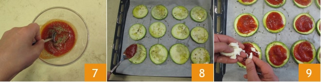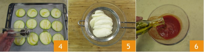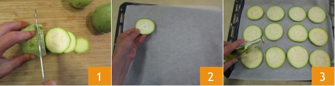 Pour préparer les pizzettes de courgettes, coupez-les en tranches de 1 cm 1 et disposez-les au fur et à mesure sur une feuille de papier sulfurisé placée sur la plaque 2. Assaisonnez avec un filet d'huile 3.