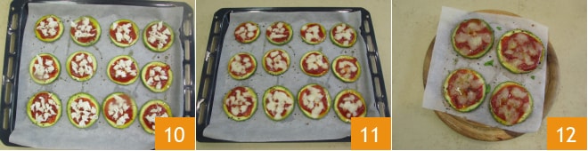 Enfournez pour encore 5 minutes 10, juste le temps de faire fondre la mozzarella 11. Vos pizzettes de courgettes sont prêtes, garnissez-les de menthe déchirée à la main avant de déguster 12.