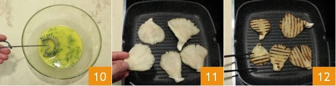 Mélangez avec un fouet pour bien amalgamer l'émulsion et réservez 10. Occupez-vous maintenant de la cuisson des pleurotes à la grille : mettez une grille en fonte sur le feu et faites-la chauffer, lorsqu'elle sera bien chaude, disposez les champignons sur la plaque 11, faites-les cuire quelques minutes de chaque côté 12 jusqu'à ce qu'ils soient bien cuits.