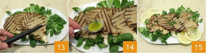 À la fin de la cuisson, retirez les champignons du feu en vous aidant d'une pince de cuisine et placez-les sur un plat de service 13. Assaisonnez les pleurotes avec l'émulsion d'huile et de citron précédemment préparée 14 et servez immédiatement vos pleurotes grillés bien chauds en décorant le plat à votre goût avec de la salade de mâche et des tranches de citron 15.