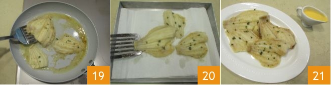 Faites cuire les filets quelques minutes de chaque côté, en faisant attention à les retourner toujours très délicatement 19, car ils se décomposent très facilement. Continuez la cuisson encore quelques minutes, puis posez les filets sur du papier absorbant 20. Servez vos filets avec la sauce hollandaise préparée précédemment 21.