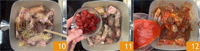 Laissez réduire le vin d'environ la moitié, il ne devra pas s'évaporer complètement 10. À ce stade, ajoutez la pâte de tomate 11 et la purée de tomate 12.