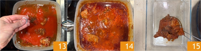 Salez 13 et laissez cuire le ragù à feu doux pendant environ 3 heures 14. Une fois ce temps écoulé, retirez la viande de la sauce 15.