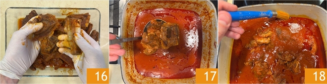 Désossez et effilochez la viande avec les mains 16, puis remettez-la dans la casserole avec la sauce 17 et poursuivez la cuisson pendant encore 3 heures à feu moyen-doux. Pendant la cuisson, vous pouvez badigeonner les bords avec un peu d'eau pour éliminer la croûte qui tendra à se former 18.