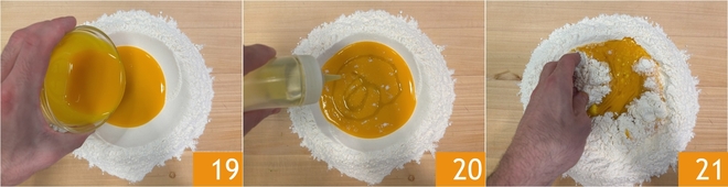 En attendant, vous pouvez vous consacrer à la pâte fraîche : placez la farine en fontaine sur le plan de travail, puis versez les jaunes au centre 19. Ajoutez le sel et l'huile 20 et commencez à incorporer les ingrédients avec les mains 21.