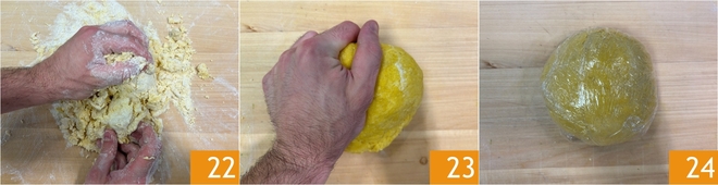 Continuez à travailler le mélange 22 jusqu'à obtenir une pâte lisse et homogène 23. Enveloppez la pâte dans du film plastique 24 et laissez reposer au réfrigérateur pendant environ une heure, une heure et demie.