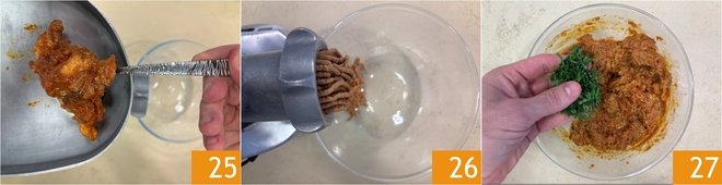 Une fois le temps de cuisson du ragù écoulé, transférez-le dans un hachoir 25 et passez-le 2 fois 26 (alternativement, vous pouvez utiliser un mixeur à basse vitesse). Réservez environ la moitié du ragù qui vous servira à assaisonner les plin, et mettez le reste dans un bol. Ajoutez le basilic coupé en julienne 27.