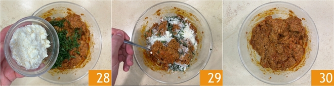 Ajoutez également le Parmigiano Reggiano râpé 28 et mélangez bien 29 pour obtenir un mélange homogène 30. Transférez-le dans une poche à douille et mettez de côté.