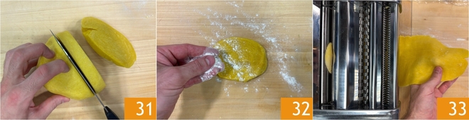 Sortez la pâte fraîche du réfrigérateur et divisez-la en portions plus petites 31. Étalez une portion à la fois en prenant soin de garder le reste couvert. Saupoudrez la pâte d'un peu de farine 32 et passez-la dans la machine à pâtes en commençant par l'épaisseur la plus large 33.