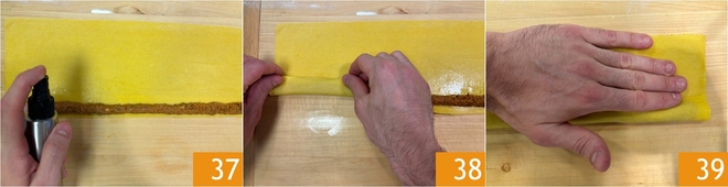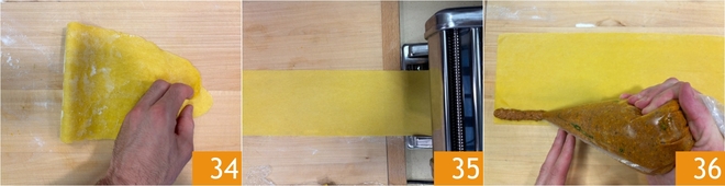 Repliez la pâte pour la renforcer 34 et passez-la à nouveau dans la machine en réduisant progressivement l'épaisseur jusqu'à obtenir la plus fine 35. Déposez la pâte sur le plan de travail et pressez la farce sur toute la longueur 36.