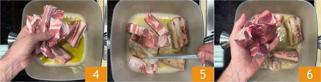 Entre-temps, préparez la viande : entaillez le flanchet, puis coupez l'échine de porc et l'épaule en morceaux plus petits. Les côtes peuvent être laissées entières. Salez la viande et faites-la dorer dans une grande casserole avec l'huile bien chaude 4. Tournez les morceaux de viande de tous les côtés pour qu'une belle croûte se forme 5. Si la casserole n'est pas assez large, vous pouvez retirer au fur et à mesure la viande déjà dorée pour faire de la place à la viande encore à dorer 6, puis l'ajouter ensuite au reste.