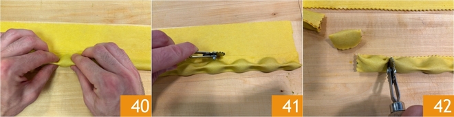 Pincez la pâte de chaque côté de la farce pour former les plin 40, puis découpez-les avec une roulette dentelée d'abord dans le sens de la longueur 41 puis pour les séparer les uns des autres 42. Continuez ainsi jusqu'à épuisement de la pâte.