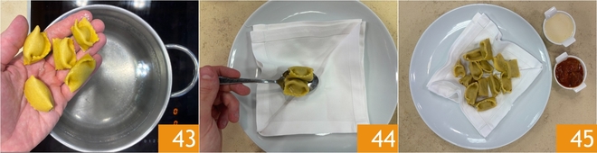 Portez maintenant à ébullition une casserole d'eau salée et faites cuire les plin pendant quelques minutes 43. Égouttez les raviolis directement sur le torchon que vous aurez placé sur une assiette chaude 44. Servez vos plin farcis de ragù napolitain avec le ragù mis de côté ou avec une sauce à base de crème et de parmesan 45 !