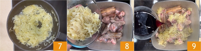 Entre-temps, les oignons auront bien compoté 7, versez-les donc dans la casserole avec la viande 8. Faites rissoler le tout pendant quelques minutes pour amalgamer les saveurs, puis déglacez avec le vin rouge 9.