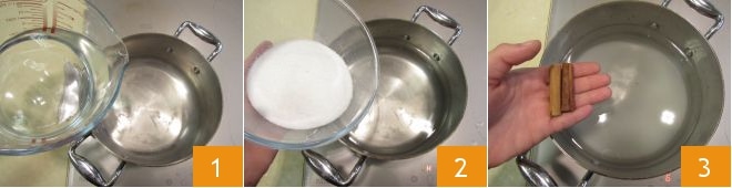 Pour préparer les poires belle Hélène, commencez par verser l'eau dans une casserole 1, ajoutez le sucre 2 et les bâtons de cannelle 3. Placez sur le feu et portez à ébullition.