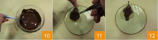 et faites-le fondre au bain-marie ou au micro-ondes 10. Dès que les poires sont tièdes, vous pouvez dresser : transférez-les sur un plat de service et versez le chocolat fondu par-dessus (11-12).