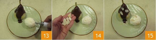 Disposez à côté une boule de glace 13 et recouvrez la poire de quelques amandes effilées 14. Servez immédiatement vos poires belle Hélène 15 !