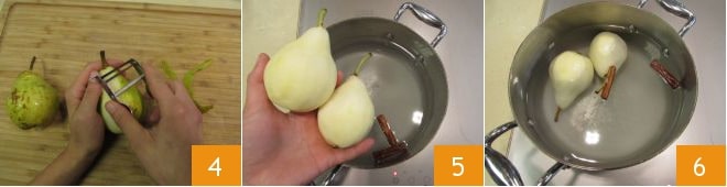 Entre-temps, épluchez également les poires 4 et lorsque le sirop commence à bouillir, plongez-les à l'intérieur (5-6).