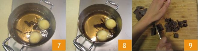 Laissez cuire pendant 25 minutes à feu moyen 7. Elles doivent être tendres, mais encore fermes. À ce stade, laissez-les tiédir dans leur liquide de cuisson. Entre-temps, hachez le chocolat noir 9