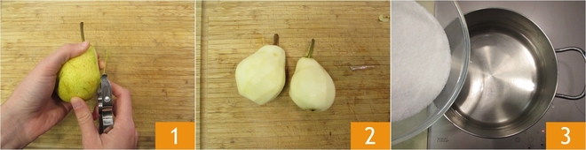 Pour préparer les poires cuites, commencez par les peler entières à l'aide d'un épluche-légumes 1, en veillant à laisser le pédoncule attaché 2. Préparez maintenant le sirop : versez dans une casserole l'eau et le sucre 3.