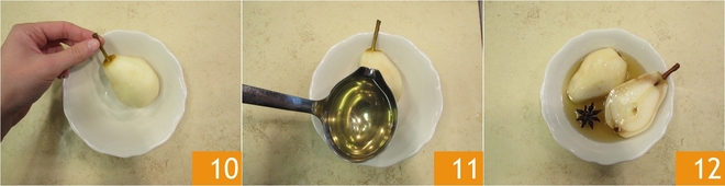 Il ne vous reste plus qu'à dresser : placez une poire dans une coupelle 10, versez dessus une petite louche de sirop 11 et servez 12. Si vous préférez, vous pouvez ajouter une pincée de cannelle en poudre.
