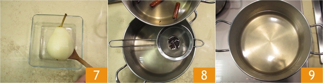 Quand elles sont prêtes, retirez-les du sirop 7 et mettez-les de côté. Filtrez le sirop à l'aide d'un tamis fin 8, pour séparer les arômes 9.