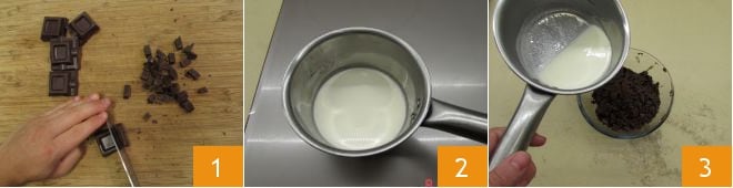Pour préparer les poires et chocolat au caramel salé, commencez par la fausse glace d'accompagnement : hachez le chocolat 1. Puis chauffez la crème dans une petite casserole jusqu'à ce qu'elle frémisse 2. Dès qu'elle est bien chaude, versez la crème sur le chocolat 3.