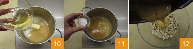 Passez ensuite au mou avec lequel les glacer. Versez donc le sucre, le beurre et le miel dans une petite casserole en acier 10, dès que des bulles commencent à se former, ajoutez le bicarbonate 11. Continuez à mélanger constamment pendant que le mélange commencera à gonfler. Quelques instants après, éteignez le feu et versez sur les pop-corn 12.