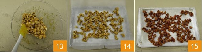 Mélangez soigneusement 13 et transférez sur une plaque de cuisson couverte de papier sulfurisé 14, espacez-les bien et faites-les cuire au four à 110°C pendant environ 15 minutes. À la fin de la cuisson, laissez-les refroidir hors du four 15.