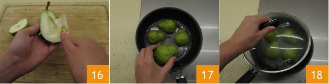 Passez aux poires. Après les avoir lavées et séchées, coupez-les en deux, retirez la tige et le cœur 16. Dans une poêle, faites fondre une noix de beurre salé et déposez les poires 17. Couvrez avec le couvercle et faites-les braiser pendant 5 minutes 18.