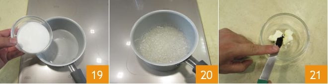 En attendant, occupez-vous du mou. Dans une petite poêle en acier, versez l'eau et le sucre 19, sans mélanger, portez à ébullition jusqu'à ce qu'une couleur ambrée soit atteinte 20. Entre-temps, vous pouvez mélanger brièvement le beurre avec les graines d'une gousse de vanille 21.