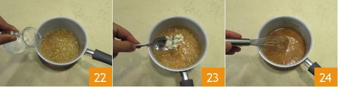 À ce stade, le caramel devrait avoir pris la couleur souhaitée, alors éteignez le feu et éloignez-vous du feu avant d'ajouter la crème tiède 22. Mélangez immédiatement et faites très attention que le mélange ne vous éclabousse pas les mains car il est extrêmement brûlant. Dès qu'il sera incorporé, ajoutez également le beurre mélangé aux graines 23 et mélangez pour obtenir une sauce visqueuse 24.