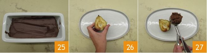 Vous pouvez procéder au dressage. Récupérez la fausse glace du réfrigérateur et avec une cuillère à glace, formez une boule 25. Sur l'assiette de service, disposez une demi-poire braisée 26, à côté la boule de glace 27,
