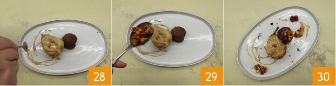 et pour garnir, le mou coulé à la cuillère 28. Terminez en ajoutant les pop-corn 29 et quelques framboises déshydratées, des fleurs comestibles et une pincée de sel en flocons. Vos poires et chocolat au caramel salé sont prêtes 30 !