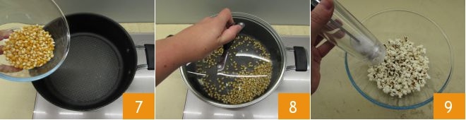 Entre-temps, occupez-vous des pop-corn. Pour les réaliser, il suffira de verser les grains de maïs dans une casserole 7, couvrez avec le couvercle et augmentez au maximum la température 8, de cette façon le maïs éclatera. Transférez les pop-corn dans un bol, salez à votre convenance et mettez de côté 9.