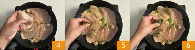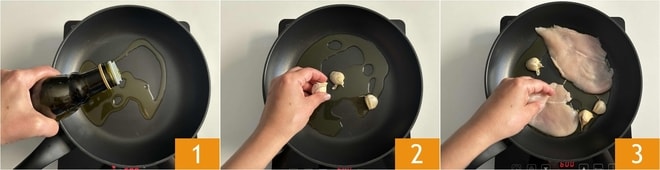 Préparer la poitrine de poulet à la poêle est très rapide, commencez par chauffer sur le feu une poêle antiadhésive avec un filet d'huile d'olive extra vierge 1 et 2 ou 3 gousses d'ail entières en chemise, mais écrasées, de manière à parfumer sans donner un goût trop persistant 2. Puis déposez les poitrines de poulet lorsque l'huile est chaude 3.