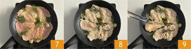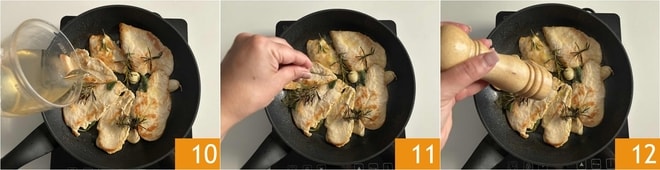 Quand la poitrine de poulet est dorée des deux côtés, déglacez avec le vin blanc 10 et faites évaporer la partie alcoolique, puis baissez le feu. Salez 11 et poivrez 12.
