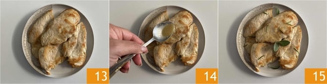 Une fois cuit, transférez-le sur un plat de service 13 en nappant avec la sauce du fond de cuisson 14 et ajoutez quelques feuilles de sauge et un peu de romarin 15. Il ne vous reste plus qu'à le servir!