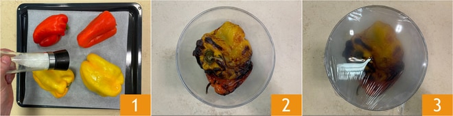 Pour préparer les poivrons au four, commencez par les disposer sur une plaque recouverte de papier sulfurisé, puis salez 1. Faites cuire dans un four préchauffé, en mode statique, à 220° pendant 50 minutes. Sortez-les du four et transférez les poivrons dans un bol 2, puis couvrez avec un film plastique 3 et laissez tiédir. La vapeur va ramollir la chair et faciliter l'épluchage.