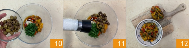 Ajoutez également les olives taggiasche 10, puis assaisonnez avec de l'huile, du sel 11 et du poivre. Mélangez et laissez reposer au réfrigérateur pendant au moins 20 minutes, afin que les saveurs se mélangent bien. Vos poivrons au four sont prêts à être servis 12 !