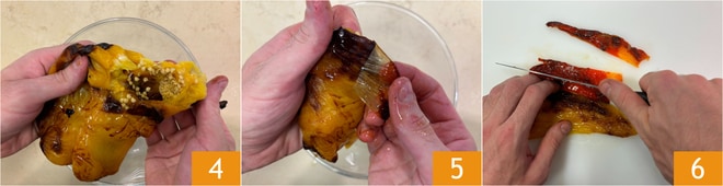 À ce stade, retirez les graines 4 et épluchez les poivrons 5. Coupez la chair en lanières d'environ 1 cm de large 6 et mettez-les dans un bol.