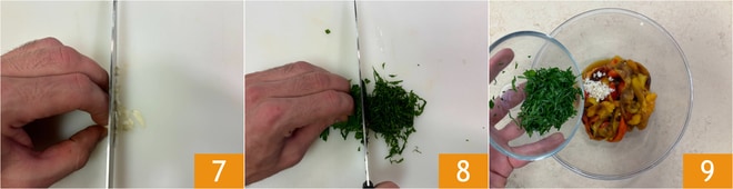 Hachez finement l'ail 7 et le persil 8, puis ajoutez-les aux poivrons 9.