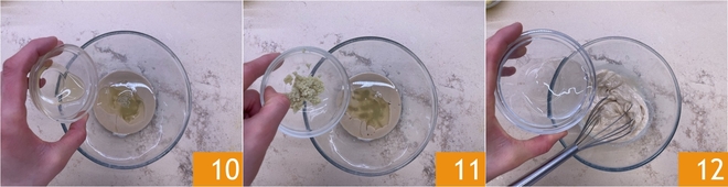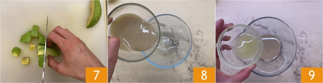 Épluchez et coupez en dernier l'avocat en morceaux 7 et maintenant préparez la sauce. Dans un bol, versez la sauce tahini 8, puis ajoutez le jus de citron 9.