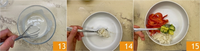 À l'aide d'un fouet, mélangez bien pour amalgamer tous les ingrédients 13. Vous pouvez composer votre poke bowl en versant le riz cuit et revenu à température ambiante 14. Puis placez à côté les poivrons et l'avocat 15.