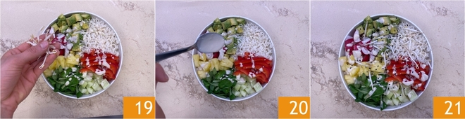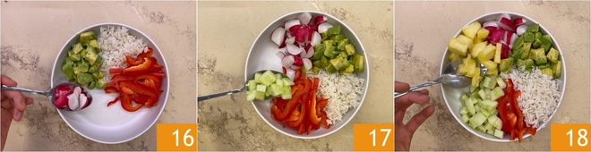 Continuez avec les radis 16, les concombres coupés en dés 17 et l'ananas 18.
