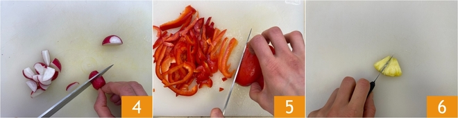 Maintenant, occupez-vous des légumes. Lavez tout. Ensuite, coupez les radis en quartiers 4 et les poivrons rouges en lamelles 5. Coupez ensuite l'ananas en tranches et ces tranches en triangles 6. Coupez également les concombres en dés.
