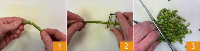 Pour préparer la polenta avec des légumes de printemps, commencez par éliminer la partie la plus ligneuse de la tige des asperges 1. Pelez ce qui reste de la tige 2 et coupez-la en petits losanges 3, en réservant les pointes.