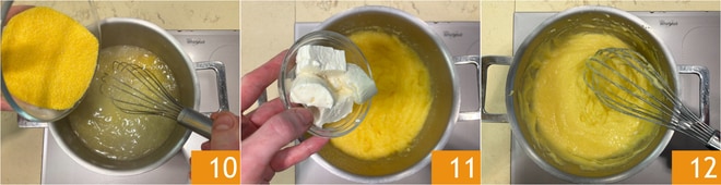 Pour préparer la polenta, portez l'eau salée à ébullition puis versez la semoule de maïs en pluie 10 et remuez continuellement avec un fouet pendant 5 minutes ou jusqu'à ce qu'elle épaississe. Éteignez le feu, ajoutez le stracchino 11 et remuez jusqu'à ce que la polenta devienne filante 12.