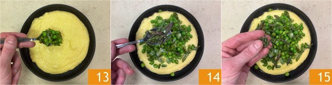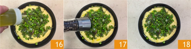 Complétez avec un filet d'huile crue 16 et une pincée de poivre 17. Votre polenta avec des légumes de printemps est prête à être servie 18